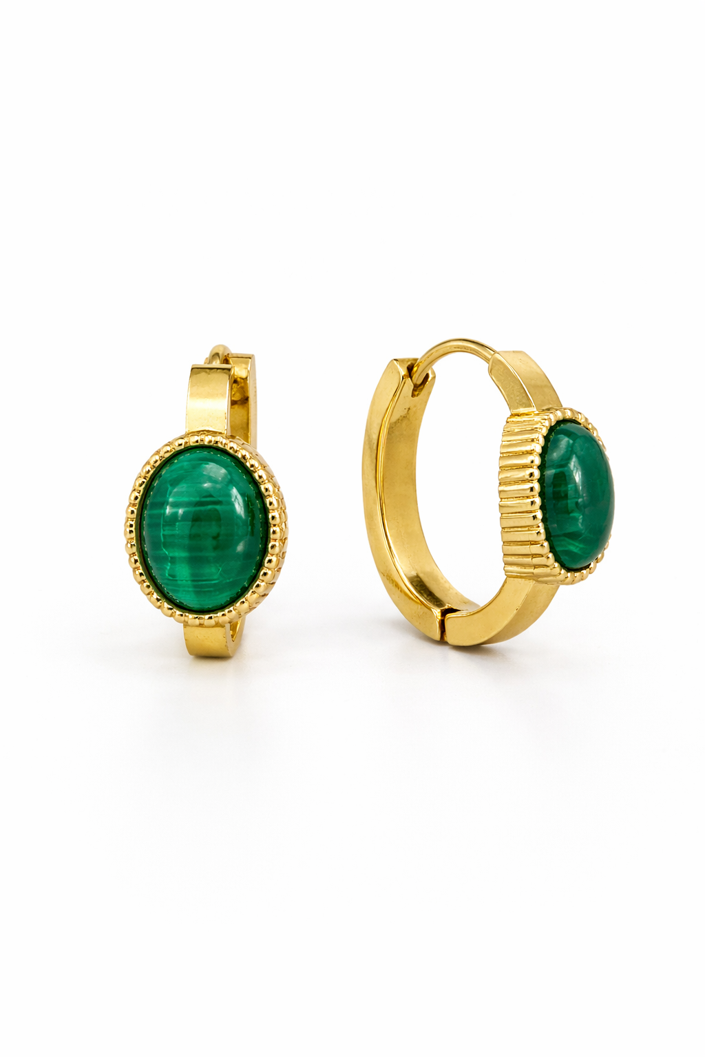 Σκουλαρίκια κρίκοι απο ανοξείδωτο ατσάλι οβάλ με πράσινη πέτρα χρυσής απόχρωσης
