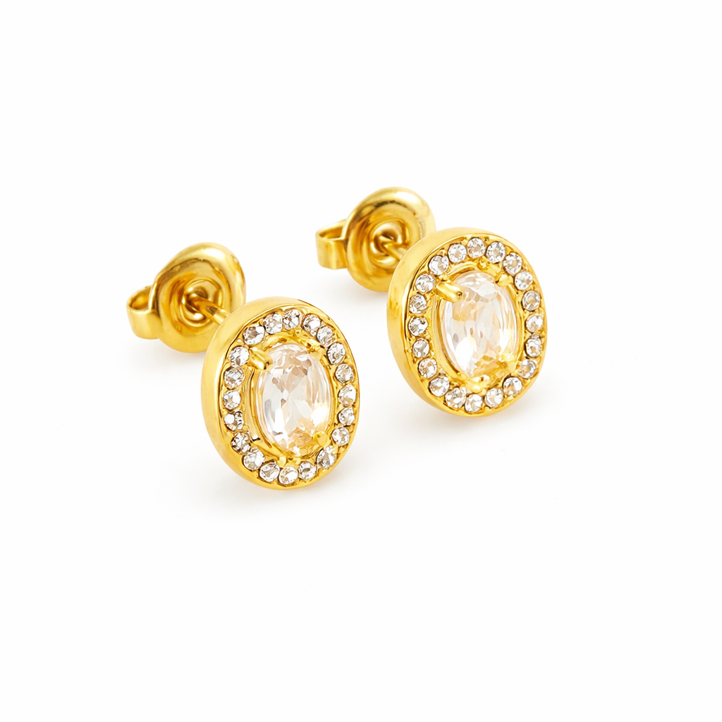 Σκουλαρίκια ροζέτα απο ανοξείδωτο ατσάλι Oval Cut με λευκό ζιργκόν χρυσής απόχρωσης